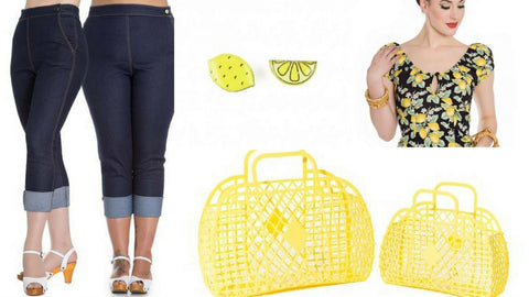 And of course you can’t just stop there. You need to add accessories! A vintage inspired wardrobe is all about bringing the whole outfit together with cute matching jewellery and bags. We have no shortage of bright and fruity accessories at Two Lippy Ladies. The latest Bok Bok B’Gerk collection features a whole range of fruits and fabulousness. Of course the perfect thing for this outfit are the lemon earrings. We also have adorable lemon cardie-clips and brooches.